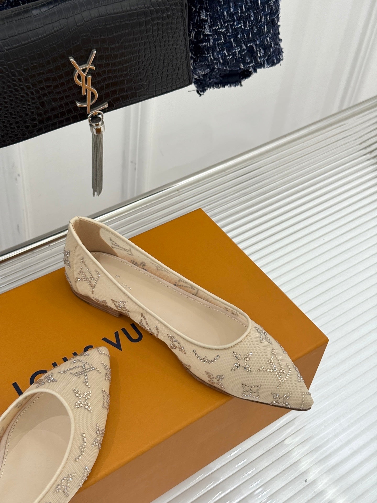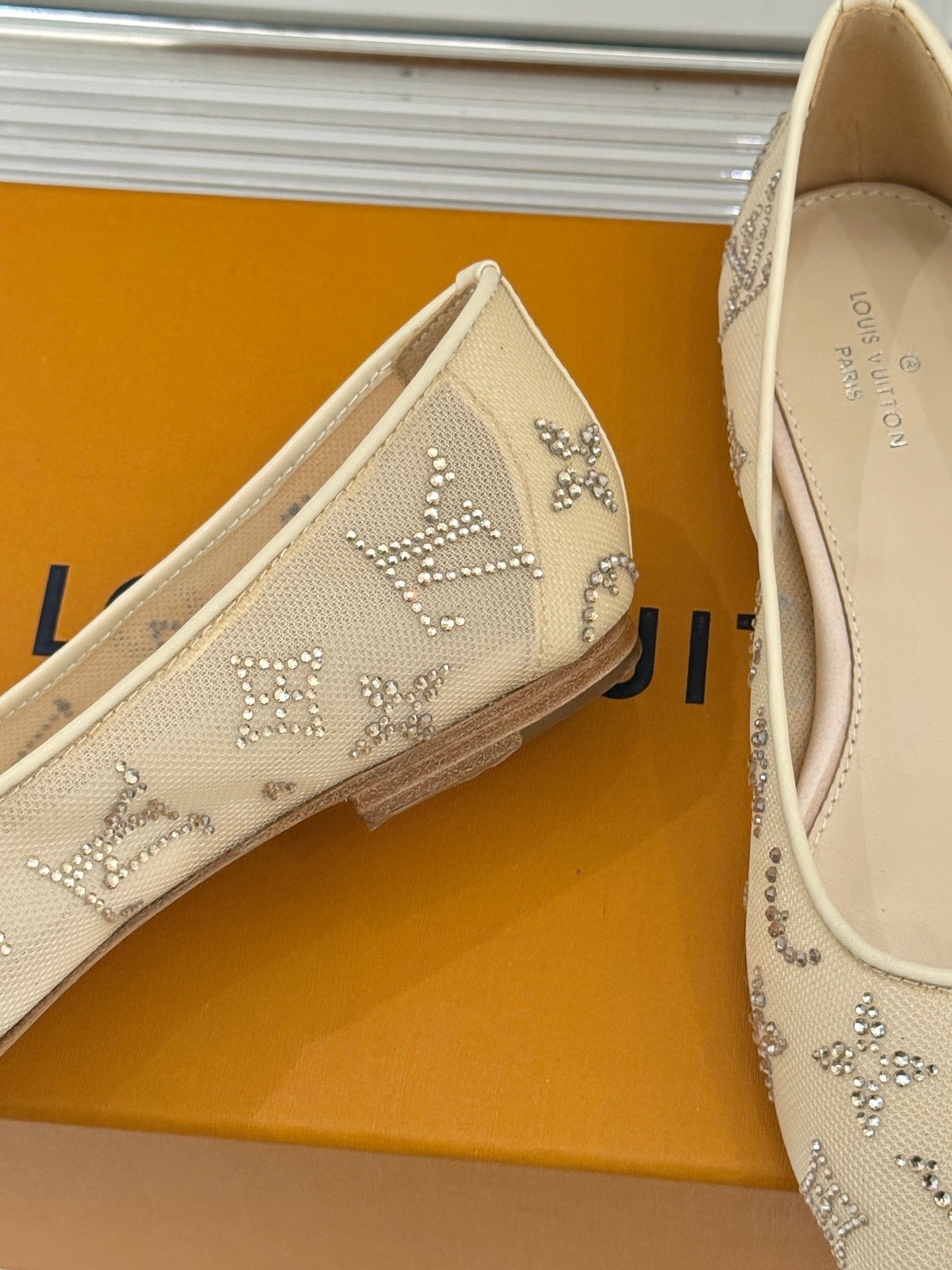 The Gala Ballerina is designed for the woman who finds 'relief in missing out' (ROMO). For a signature Aylas Edit look, pair the Nude crystals with a silk Nicolas Ghesquière slip dress or the collection's technical bathrobe-style coat. The mesh creates a beautiful textural contrast when worn with sheer, fluid draperies. For a more street-wise ensemble, style them with layered tailored bermuda shorts to allow the rhinestone monogram to catch the light during the day.