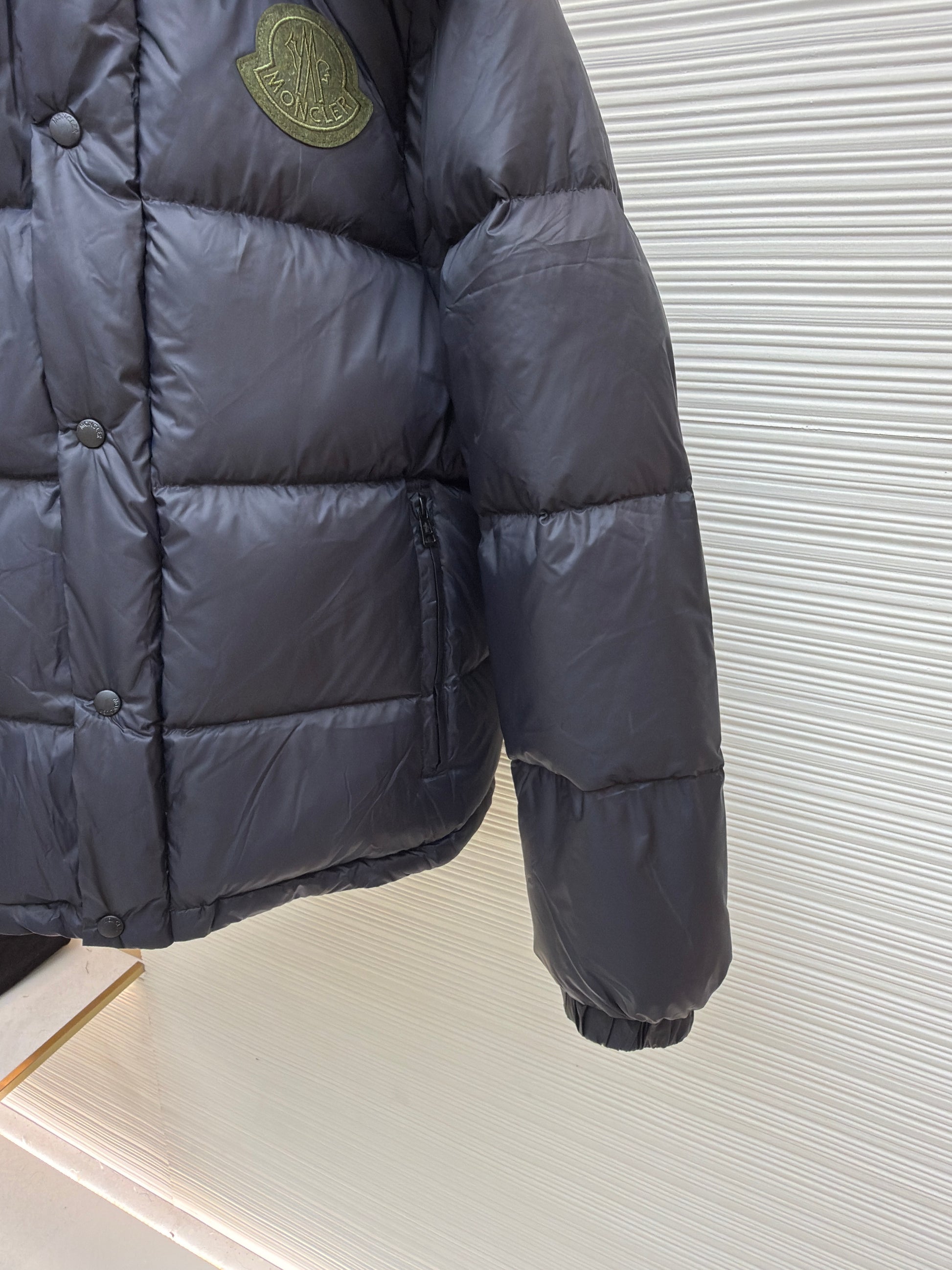 The piece features a chic matte navy finish and is generously filled for superior warmth without excessive bulk. Key details include the signature felt Moncler logo patch on the chest, a sturdy front snap-button closure, and a convenient stand-up collar with a contrasting hood that zips away. Search for the Moncler Cyclone 2-in-1 jacket to elevate your cold-weather looks with adaptable, high-fashion mountaineering appeal.